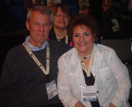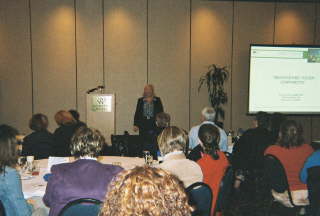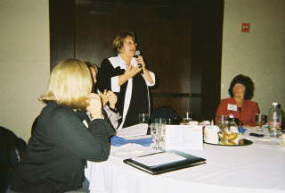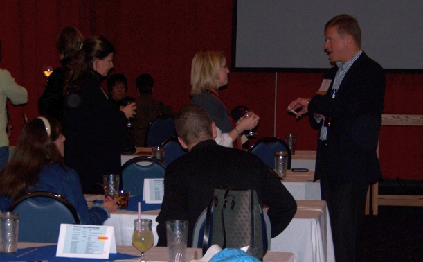 Lunch on Sunday featured a tailgate buffet of burgers and dogs, as well as Cracker Jack and football-shaped cookies. Speaker Mary Boone outlined how Monday's "unconference" format would work. She explained that most meetings are conducted in "broadcast mode," but more learning actually happens in social settings, so the Conversation Cafés would provide that relaxed opportunity for idea sharing. Topics were grouped into categories: future/trends, bridging generations/cultures, strategic planning, green issues, plus a potpourri category for any other topic. People had the opportunity to sign up ahead of time with a topic question, then anyone was welcome to join the conversation Monday morning at the assigned table for that topic. Groups ranged from two or three people to more than a dozen per topic.