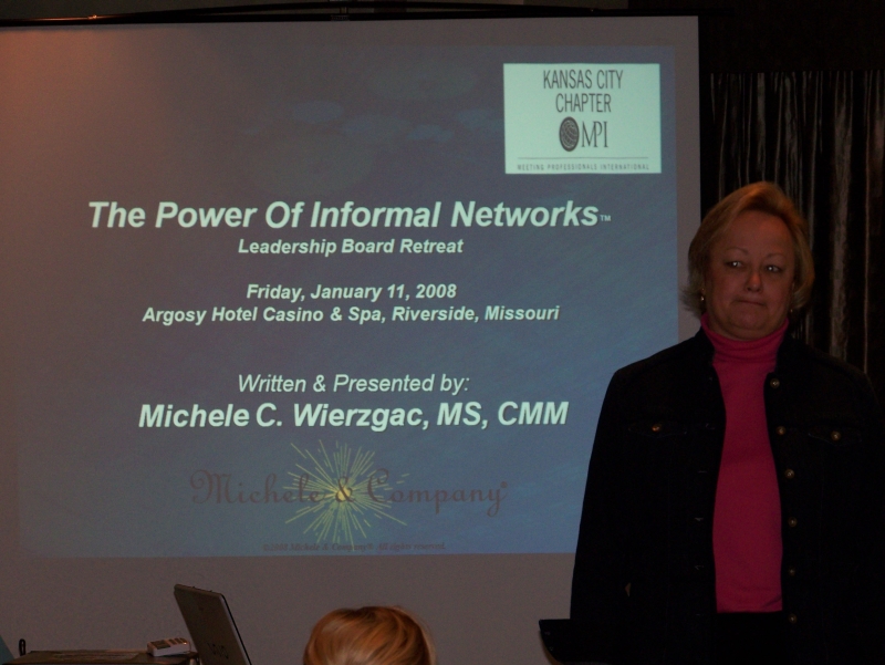 KCMPI's Board of Directors and officers gathered for their midyear retreat in January at the Argosy Casino in Riverside. Following the Board of Directors meeting, President Inge Hafkemeyer, CMM, led the group in a discussion of the past success of the chapter and future goals. The next day, facilitator Michele Wierzgac, CMM, organized an interactive session on formal and informal networking.