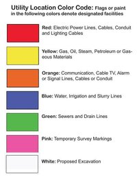 When a Locate Technician arrives on your property, they will locate and mark the buried utilities relative to your proposed excavation project with paint, stakes, or flags. Those markings will be in accordance with the universal colour code and should be in sufficient quantity, and close enough together, to clearly identify the horizontal alignment of the buried facilities.