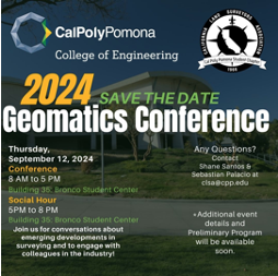 Announcing the 2024 Geomatics Conference! Join us on Thursday, September 12, at Cal Poly Pomona’s Bronco Student Center for a full-day event from 8 AM to 5 PM, followed by social hours from 6 PM to 8 PM. Stay tuned for more details. Questions? Please reach out to us at clsa@cpp.edu. Looking forward to seeing you there!