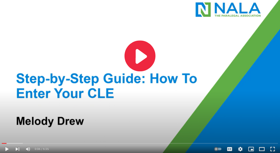 As a Certified Paralegal (CP®), it is imperative that you know how to enter your CLE credits into your NALA account so that you can qualify for recertification. We made a video to serve as a step-by-step guide on entering your CLE credits. In addition to showing you how to add CLE credits to your NALA account, it also explains the three types of CLE: substantive, non-substantive, and legal ethics. To learn more about the different types of CLE and how to enter them into your account, click below to watch the video.