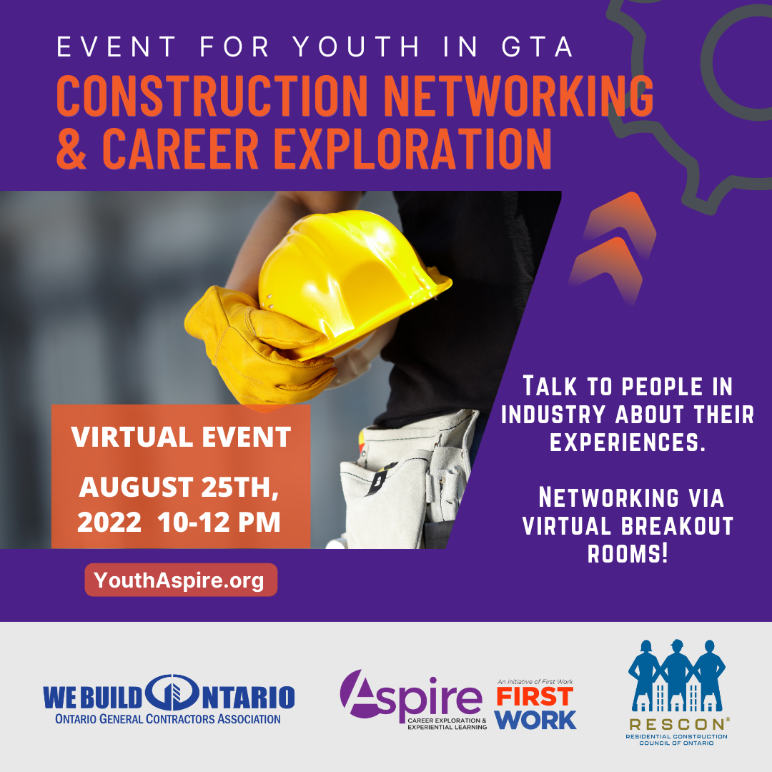 First Work’s Aspire initiative will host a virtual career exploration event for the Construction Industry for youth Join folks from the construction sector to network and learn more on August 25 from 10 a.m. - noon. Hear industry professionals share experiences from their career journeys, learn about possible career opportunities and get advice on how to map out your own career path. Come prepared with your resume and get ready to network in breakout rooms with people in the field who want to get to know YOU and what you offer. Click here to register: Construction Networking & Career Exploration Event - Youth Aspire |