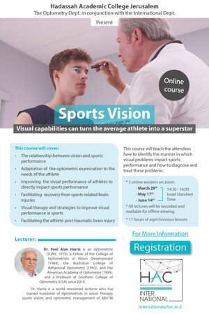 The Masters of Optometry and Vision Science Department at Hadassah Academic College in Jerusalem would like to invite you and additional Fellows of your institution to attend a unique optometric specialization course: "Sports Vision," directed by Dr. Paul Harris, world renowned lecturer and expert in his field of Behavioral Optometry.