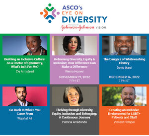 Two remaining live sessions; Previous sessions available for viewing online You are invited to join a series of powerful, one-of-a-kind webinars on a host of diversity topics by world-renowned content experts from outside optometry. Called the ASCO Eye on Diversity Speaker Series, sponsored by Johnson & Johnson Vision, this series of six powerful sessions will reveal unique insights and perspectives on diversity, equity, inclusion, accessibility, and belonging issues that face optometry students, residents, faculty, practitioners, and their staff members on a daily basis.