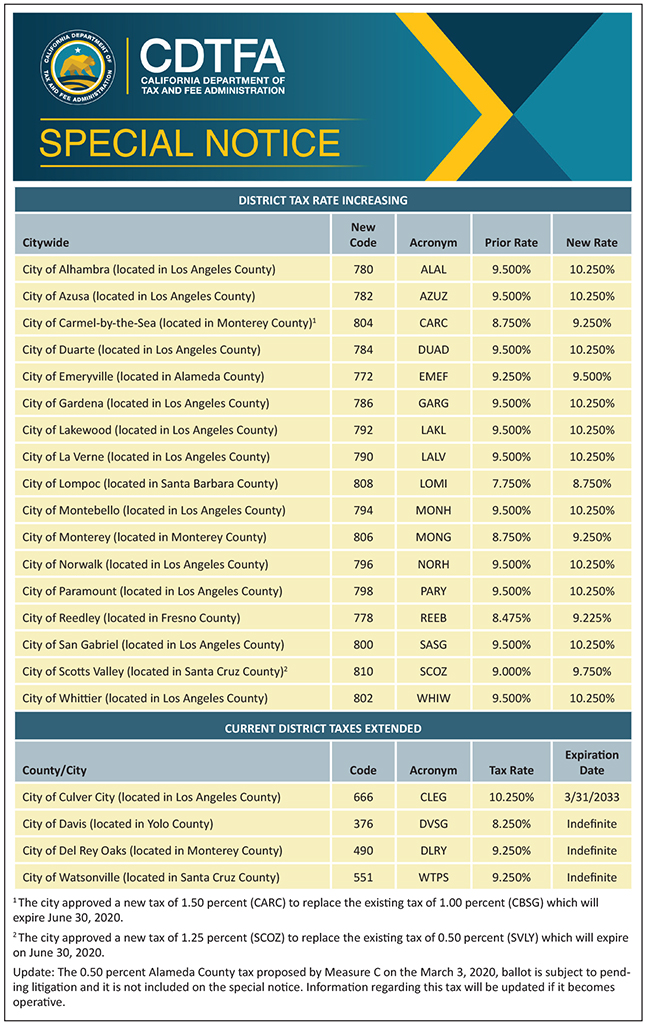 California Department of Tax and Fee Administration (CDTFA) has listed tax rate changes above, which apply only within the indicated city or county limits. The new tax rates, tax codes, acronyms and expiration dates will be available to view and download as a spreadsheet prior to July 1, 2020, on our California City & County Sales & Use Tax Rates webpage (scroll down to Download for the spreadsheet). To find the specific tax rate for your area or business location, go to Find a Sales and Use Tax Rate by Address. The new rates will be displayed on July 1, 2020. You may also call the Customer Service Center at 1‑800‑400‑7115 (CRS:711). Customer service representatives are available to assist you Monday through Friday from 8 a.m. to 5 p.m. (Pacific time), except state holidays.