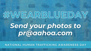 January is National Slavery & Human Trafficking Prevention Month, and Tuesday, January 11, is National Human Trafficking Awareness Day. To show our commitment to ending human trafficking, AAHOA is wearing blue in honor of #WearBlueDay, and we're inviting you to join us. We are asking you take photos of yourself and your team wearing blue and share them on AAHOA’s social media – Facebook, Twitter, and Instagram – as well as your personal channels using the #WearBlueDay hashtag. Also, if you’re able to take your photo in advance of January 11, send it to pr@aahoa.com to be highlighted in AAHOA’s campaign. If you're an AAHOA Member and haven't already done so, get yourself and your staff trained to recognize the signs of trafficking through our Businesses Ending Slavery and Trafficking (BEST) Inhospitable to Human Trafficking Training Sponsored by AAHOA FREE online training.