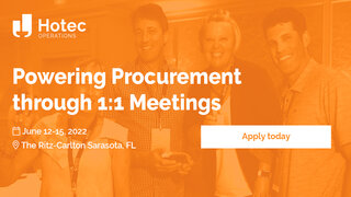 The hotel operations community reunites June 12-15 at Hotec Operations 2022! Hotec Operations brings together senior executives of leading hotel chains, top hotel management companies and purchasing companies face-to-face with innovative suppliers for three days of pre-scheduled, 1:1 meetings and exclusive networking opportunities. A relaxing, luxurious, intimate setting provides the perfect backdrop to meet, engage, and do business with unprecedented ease, effectiveness, and speed. Fully hosted buyers receive complimentary airfare, transfers, hotel stay, meals, personalized 1:1 meeting schedule and more! Apply today at www.hotecoperations.com.