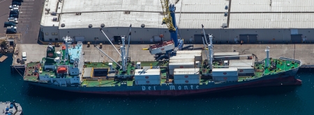 ![]() Embarcación de Del Monte descargando contenedores repletos de fruta en su moderna instalación refrigerada en muelle en Hueneme