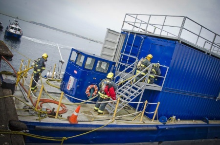 San Diego: Departamento de Policía del Puerto exhibe nuevo buque de instrucción táctica El Departamento de Policía del Puerto de San Diego ha obtenido un nuevo buque escuela táctico, un recurso regional para ayudar a las agencias de la ley del Condado de San Diego a prepararse para escenarios de incendios marítimos y seguridad pública. El buque escuela de $380.000, que cuenta con tres niveles, está equipado con dos cámaras de combustión controladas de manera remota ajustadas con un sistema de fuego en vivo basado en propano. Permite escenarios realistas de instrucción donde los bomberos abordan la nave y bajan al compartimiento de "máquinas" para luchar contra incendios. En 2013, la Policía del Puerto respondió a varios llamados de buques en fuego, de los cuales siete fueron incendios activos. Por ejemplo, el 6 de octubre de 2013, un incendio eléctrico inició a bordo del "Dorado Discovery," un buque de investigación de 321 pies de eslora con pabellón británico que estaba anclado en el Tenth Avenue Marine Terminal. Aunque nadie salió lesionado, la respuesta al incendio implicó la cooperación de diversas agencias incluyendo la Policía Portuaria, el Departamento de Bomberos de San Diego, el Departamento de Bomberos de National City, el Departamento de Bomberos de Coronado y personal experto en materiales peligrosos, así como el Guardacostas de los EEUU. "Nuestros Oficiales de la Policía Portuaria pusieron sus vidas en la raya ese día para mantener segura a la Bahía de San Diego Bay y por eso necesitan la mejor capacitación posible", dijo el Jefe Interino de la Policía Portuaria Mark Stainbrook. "Este instructor táctico simula las condiciones a bordo de una embarcación o un bote y permite a nuestros oficiales realmente luchar contra un incendio en un ambiente controlado, dándoles una experiencia realista que se traduce en efectividad cuando sucede lo peor".