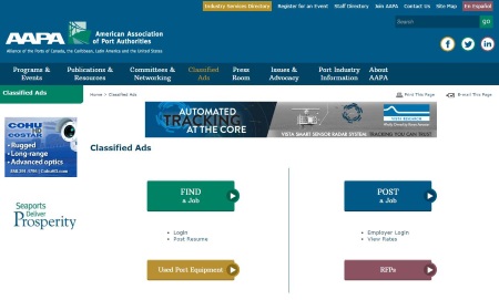 La AAPA estrenó la semana pasada un nuevo tablero de anuncios (bajo la pestaña "Classified Ads" en la página web) para brindar un mejor servicio a los buscadores de empleos y empresas de las industrias marítima y portuaria. El formato del nuevo tablero permite que los usuarios que buscan empleos hagan un perfil personal en el sistema, suban el currículum vitae, guarden empleos de interés o realicen búsquedas avanzadas por categoría o región geográfica. Las empresas pueden realizar búsquedas por currículum y también crear su propia página de perfil detallando sus ofertas laborales, misión y valores, logotipo y políticas de empleo.