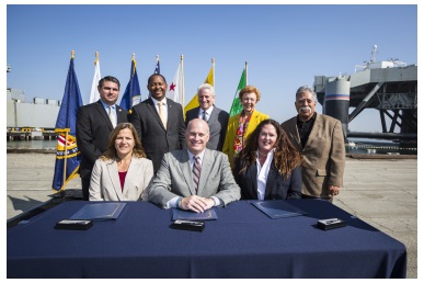 Seated, from left: Kim Ostrowski, Director of the Navy Base Realignment and Closure Program Management Office West; Maritime Administrator Paul "Chip" Jaenichen; Harbor Commissioner Tracy Egoscue. Standing, from left: Richard Cameron, Port Managing Director of Environmental Affairs and Planning; Long Beach Vice Mayor Rex Richardson; Port CEO Jon Slangerup; former Long Beach Mayor Beverly O'Neill; and Long Beach Councilmember Roberto Uranga.