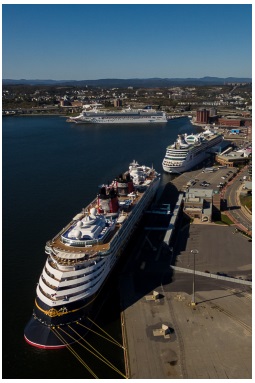 Port Saint John hosted these three cruise ships simultaneously on October 5. From left, Norwegian Gem at Long Wharf Terminal, Regal Princess approaching Marco Polo Cruise Terminal, and Disney Magic at Diamond Jubilee Cruise Terminal. Photo/Port Saint John