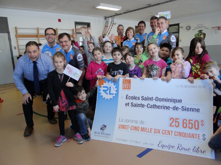 Trois-Rivières, QB - On Dec. 16, the Roue libre-Port de Trois-Rivières team made a generous donation to the students of Saint-Dominique-et-Sainte-Catherine-de-Sienne School of $25,650, which it raised by participating in the Grand défi Pierre Lavoie (GDPL).