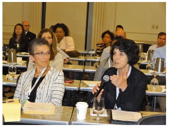 Deb Deluca, Duluth Seaway Port Authority, poses a question to panelist Ed Galligan, executive director for the Port of Olympia