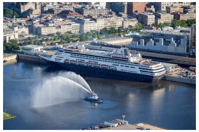 Fireboat saluting Holland America’s Maasdam, the first ship to dock at Montreal’s new Alexandra Pier cruise facility
