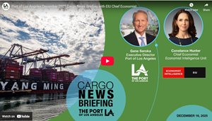 The Port of Los Angeles processed 782,249 TEUs in November 2025, a 12% decrease compared to elevated cargo levels in November 2024. With one month remaining in the year, total cargo volume reached 9,447,731 TEUs, representing a 1% increase over 2024. At a media briefing, Port Executive Director Gene Seroka stated that the Port is expected to finish 2025 with more than 10 million TEUs, placing it among the top three cargo years in its history. November volumes included 406,421 loaded import TEUs, 113,706 loaded export TEUs, and 262,122 empty container units, all of which declined compared to last year. The briefing also included remarks from Constance Hunter, Chief Economist at the Economist Intelligence Unit, who discussed tariffs, economic impacts, and the trade outlook for 2026.