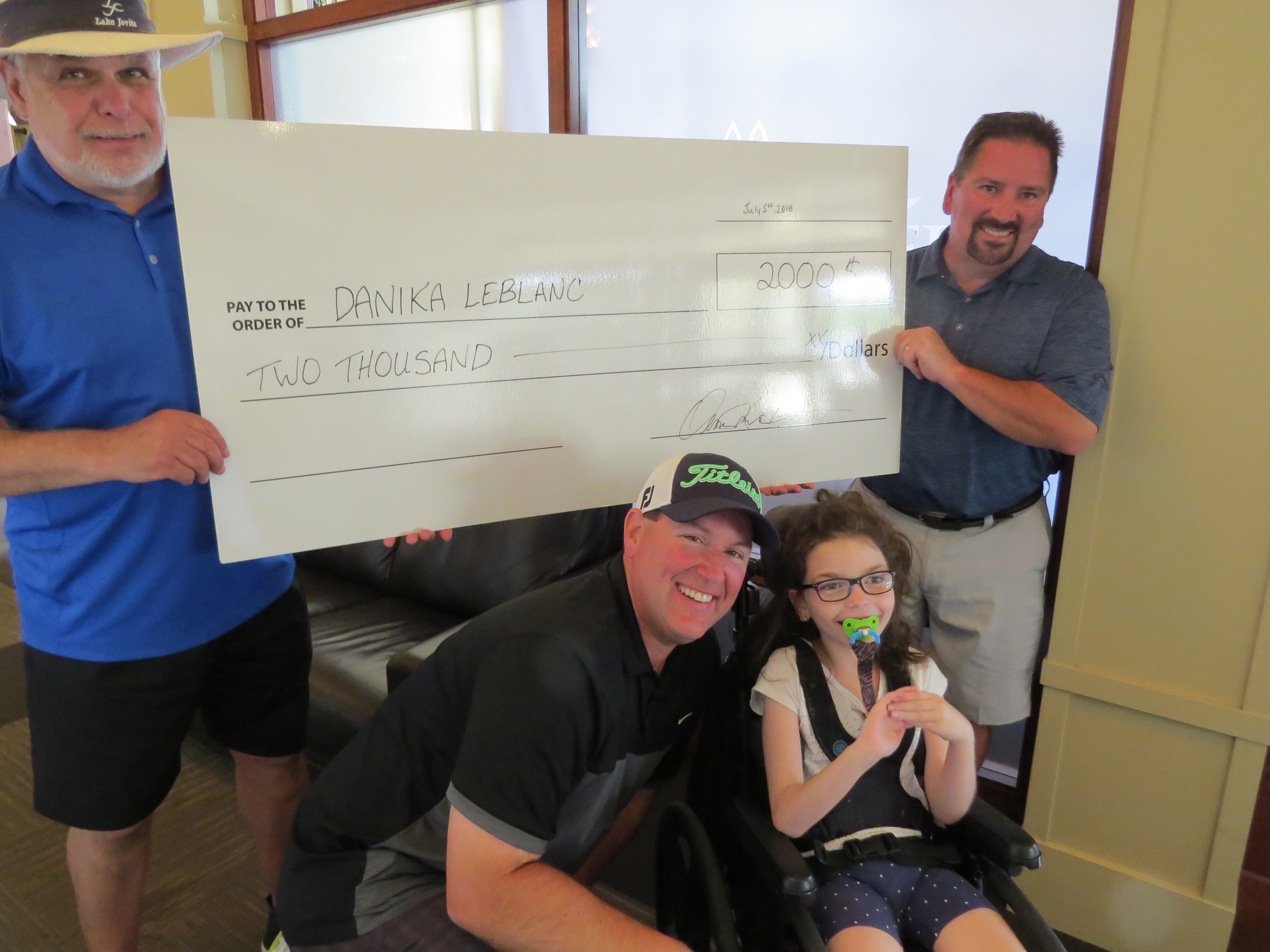 ABSDA was recently made aware of a child (Destiny LeBlanc), residing in the Greater Moncton area who was in need of a new wheel chair. Destiny has a condition known as Rett syndrome (RTT) is a genetic brain disorder which typically becomes apparent after 6 to 18 months of age in females.The initiative, which was started by her school class, was to raise $10,000 to cover the cost of a specialized wheel chair which would be custom fitted for Destiny. ABSDA presented $2,000 to the fund to allow the goal of $10,000 to be met. Holding the cheque are Platinum Sponsors Terry Mulock, Castle Building Centres Group and Mark Dill, Taiga Building Products. In the foreground is ABSDA President Denis Melanson and Destiny LeBlanc.