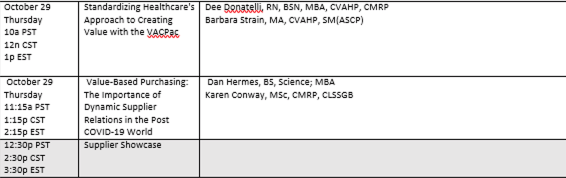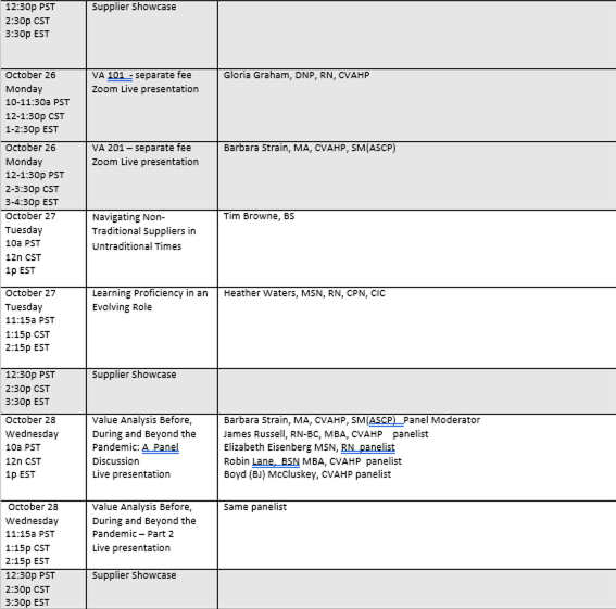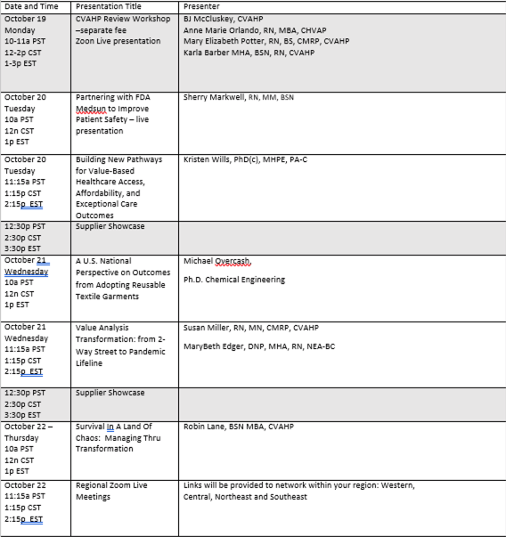We are getting close to the Annual Conference, which starts on Monday, Oct. 19 with a CVAHP Review Workshop Pre-session and runs Tuesday, Oct. 20 through Thursday, Oct. 22 each day for three hours starting at noon CST. There will be two 60-minute presentations by Value Analysis thought leaders and a Supplier Showcase for an hour after the presentations. The Conference begins again on Monday, Oct. 26 with another pre-session, VA 101 and VA 201. On Oct. 27-29, there will again be two 60-minute presentations and the Supplier Showcase following the last presentations.