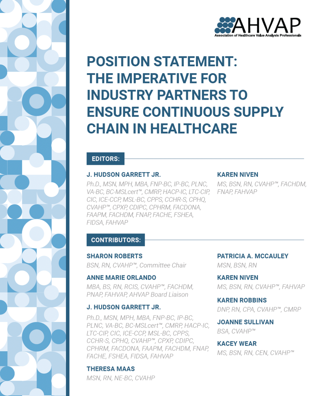 The Imperative for Industry Partners to Ensure Continuous Supply Chain in Healthcare. This newly developed and released document was designed to help define and shepherd best practices for product and supply chain continuity across the continuum. Our Industry Partners play a critical role in ensuring product availability so that clinical continuity of care is not negatively impacted. This new Position Statement is now available on the AHVAP Website.