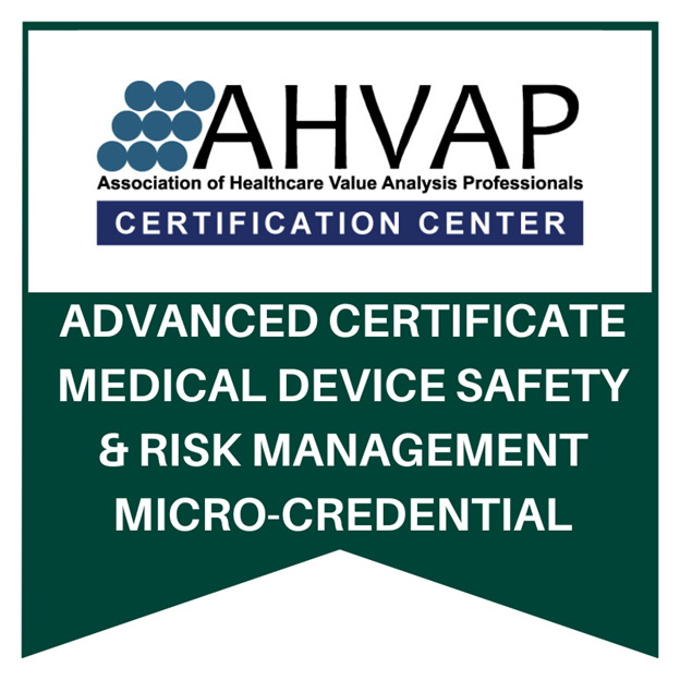 Building on the foundation established by the Medical Device Safety Value Analysis Specialist micro-credential, the AHVAP Certification Center is proud to introduce the Advanced Certificate in Medical Device Safety and Risk Management Micro-Credential. This prestigious program delves deeper into the critical aspects of risk management, patient safety, healthcare quality, and strategies for the prevention and mitigation of adverse events. Designed for healthcare professionals seeking to enhance their expertise and impact in the field, this course is a rigorous exploration of the challenges and solutions in maintaining the highest standards of safety in medical device management. This advanced level program is case-based and will use real-world medical device challenges as the basis for the coursework.