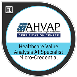 The Association of Healthcare Value Analysis Professionals (AHVAP) Certification Center is pleased to announce that registration for our innovative new micro-credential program: Healthcare Value Analysis AI Specialist Micro-Credential November Cohort is OPEN. This micro-credential introduces healthcare value analysis professionals to the practical application of artificial intelligence (AI) in healthcare value analysis processes. It covers core AI concepts, explores current use cases, and empowers participants to apply AI tools in real-world decision-making scenarios. Participants will complete a guided course project, reinforcing their learning through hands-on experience with AI-supported value analysis tools and techniques.