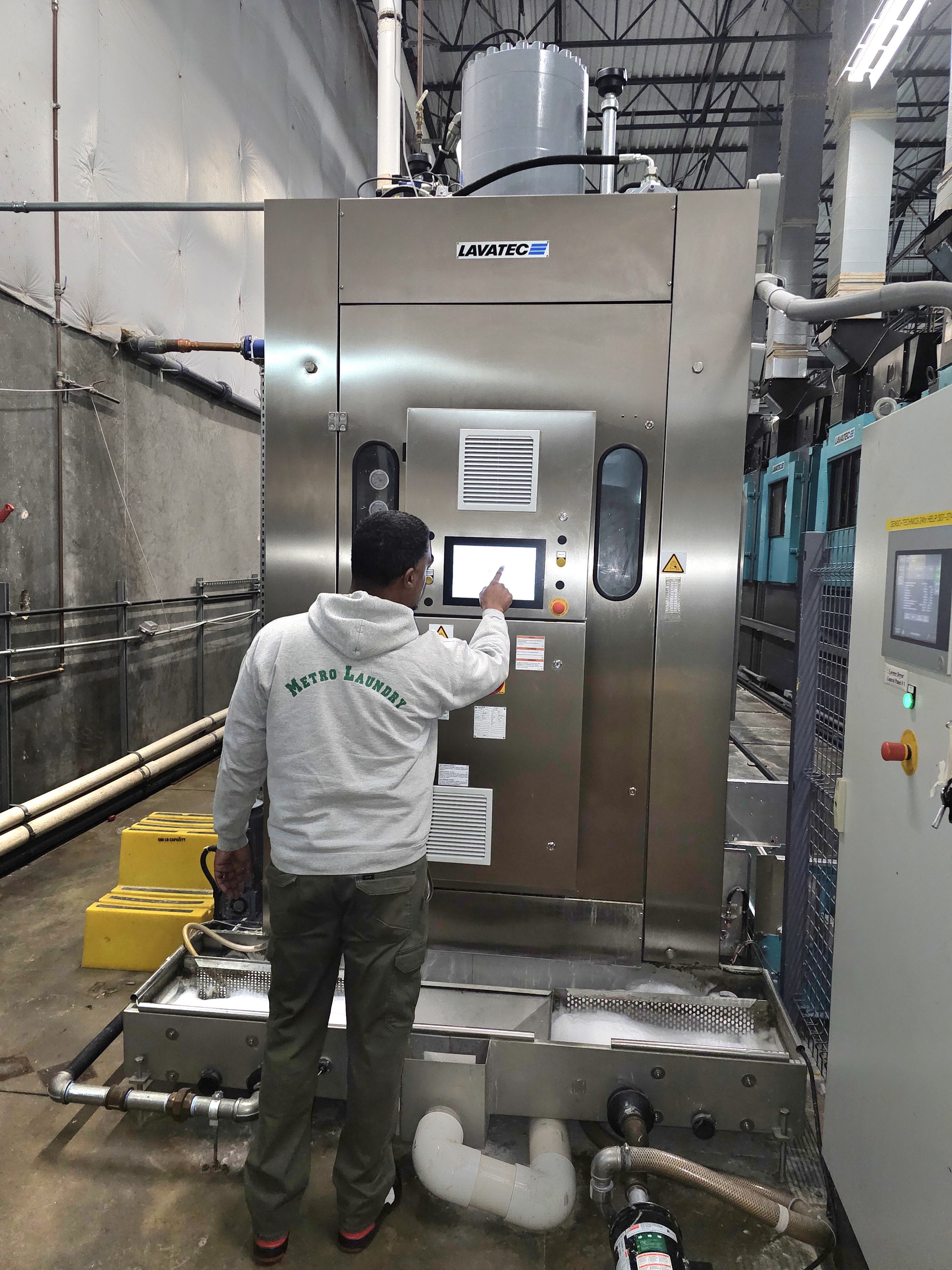 A Metro Laundry Service operator makes adjustments to the 15 compartment LAVATEC tunnel wash system the company has run since 2012.