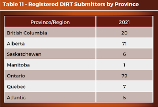 Before it unified services with Alberta One-Call Corporation, the Alberta Common Ground Alliance did a tremendous job promoting the benefits of DIRT and damage reporting in general. The ABCGA reached out to Alberta's digging community and over time, generated their trust and collaboration, the outcome of which is noted by the number of registered DIRT submitters in the province of Alberta – 71! For a province with a population less than 5 million people, securing 71 DIRT submitters deserves recognition and should be celebrated.