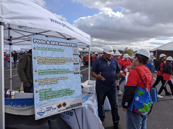 Both the Central and Southern Arizona Chapters participated in their local Arizona Construction Career Days. Roughly 9,000 kids came through the events. Contacts were made with the CTE instructors for our members to visit their classes and discuss pool career opportunities in detail and teach some basic skills.