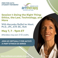 Join us virtually for AATA’s Continuing Education series on ethics in art therapy. The first session of the 3-part Ethics CE series, Doing the Right Thing: Ethics, the Law, Technology, and More, will be presented by former AATA President and Honorary Lifetime Member Mercedes Ballbé ter Maat, Ph.D., LPC, ATR-BC, HLM on May 7.  The second session will be presented on May 14: Same, Same But Different—Exploring and Comparing Art Therapy History, Education, and Practice in the US and India. Aishwerya K. Iyer ATR, MA, will share her experiences both as an art therapist in the US and as an educator in India’s first Master’s art therapy program at MIT-ADT University in Pune.   The third session, Beyond the Breach: Strategies for Responding to Confidentiality Crises, will be hosted by Traci Bitondo PhD, LPC, LPAT, ATR-BC, ACS, ATCS on May 28.