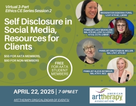 Please join us April 22 at 7 p.m. ET for Self-Disclosure in Social Media, the second session in our 2025 Ethics Series. Panelists will discuss the challenges therapists face when sharing personal or professional content online, including the implications of self-disclosure or blurred boundaries in the client-therapist relationship that may occur through posting content.  Learn more about our stellar presenters (and AATA volunteers!) through this blog post where they share insights about their approaches to ethical decision-making when faced with uncertainty, best practices, and more. This session is FREE for AATA Student Members and discounted for AATA Members. Please join us on April 22 for a live, virtual conversation—or watch On Demand anytime.