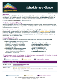 Thanks to our stellar presenters and conference volunteers, we expect our Annual Conference to be an amazing experience full of learning and connection. Just take a look at this Schedule-at-a-Glance and you'll be able to browse the 150+ CE sessions included with your registration, plus networking and evening events. Or, take a look at the sessions by subject track: > Clinical Approaches includes Addictions/Substance Abuse (AS), Child/Adolescents (CA), Forensics (FS), Geriatrics (GE), Medical Settings (MS), Psychiatric Settings (PS), and School Settings (SS)