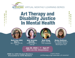 Join us for a virtual Continuing Education session, Art Therapy and Disability Justice in Mental Health, with presenters Miki Nishida Goerdt, LCSW, LCSW-C, ATR-BC; Beth Ann (BA) Short, MA, LCAT, ATR-BC, ATCS; Noel King, MAAT, ATR-BC, PhD Candidate; and Nicky Sullivan, Art Therapy Master’s Student at George Washington University. They’ll discuss the principles of disability justice—a framework that centers the experiences and needs of people with disabilities, recognizing that disability doesn’t exist in a vacuum—and the role art therapists play in this framework as mental health professionals.  AATA will be offering real-time ASL interpretation for this session. The presenters also have requested that we host the session as a video meeting on Zoom (rather than a webinar) to create a more interactive experience for the speakers and attendees. As a result, we will be unable to record the session for on-demand viewing. Please plan to attend the session live on Tuesday, July 29, 7–9pm ET.