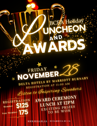 Celebrate the season, connect with industry peers, and honor BCEA’s Award winners and Alumni inductees. Delta Hotels Burnaby Conference Centre, Friday, November 28, 2025 Registration: 11:00 AM | Lunch: 12:00 PM Tickets: Members: $125 | Table of 8: $900* | Non-Members: $175 *Use promo code 8Table or email support@bcea.bc.ca to book a table. Sponsorships Available: Speaker Sponsor: $2,500
