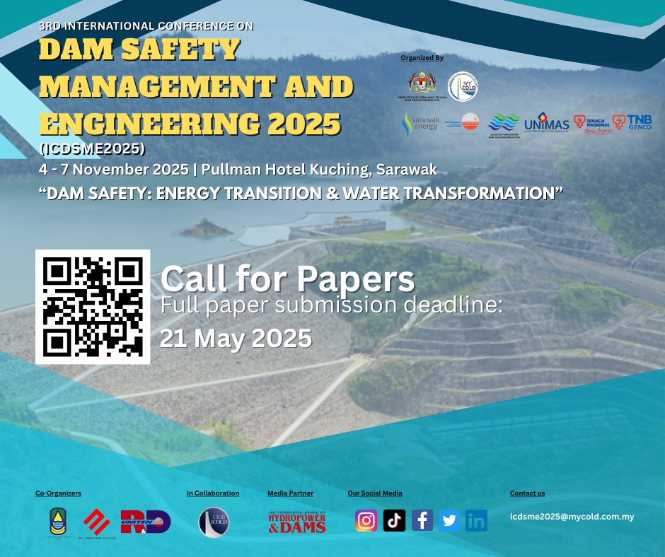The 3rd International Conference on Dam Safety Management and Engineering (ICDSME2025) will take place on November 4-7, 2025 in Kuching, Sarawak, Malaysia, with the theme of "Dam Safety: Energy Transition & Water Transformation."