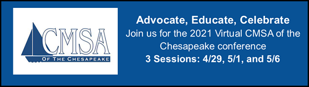 Unfortunately, our annual conference in April 2020 was postponed due to the pandemic. It usually brings in about 200 case managers and 40 vendors from all over MD, DC, VA, PA, and DE. We are pleased to be offering a 5 CEU Virtual Conference this year, spread over two evening and one Saturday session on April 29th, May 1st, and May 6th. We want to thank other Chapters for showing how that can be done! We have many of our vendors that have agreed to stay on, and we will be offering them special highlights during the event, as well as in a resource book and on our website. We are planning for another multi-session event in the fall. To register or learn more, click 2021 CMSA Chesapeake Conference