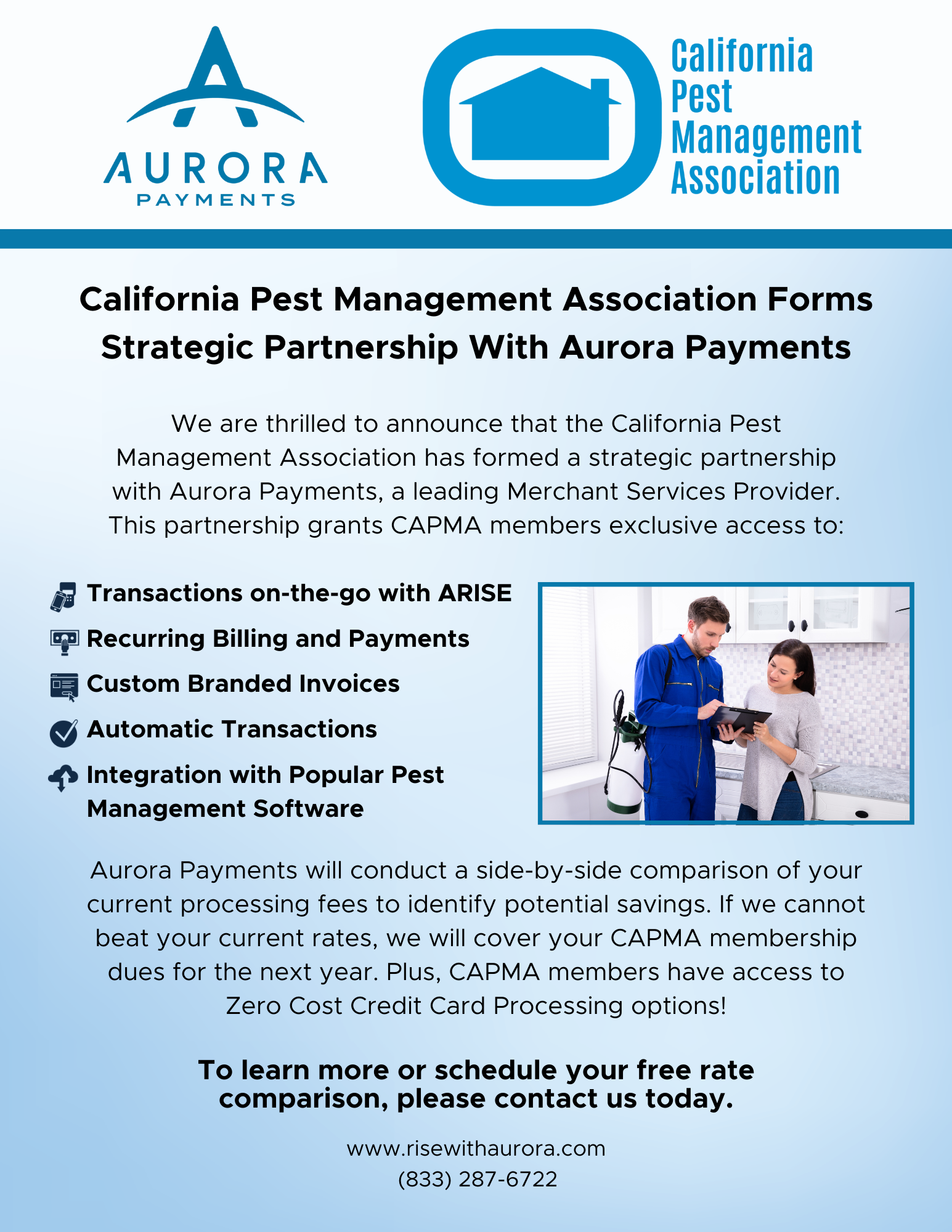 The California Pest Management Association has recently formed a strategic partnership with Aurora Payments, a leading Merchant Services Provider. CAPMA members now have access to low-cost group rate processing fees, recurring billing, integration with popular software, and on-the-go payment solutions. CAPMA serves as an advocate and promoter of business and economic interests for the state of California.