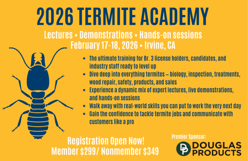 Termite Academy 2026Termite Academy is an immersive training designed for Branch 3 license holders, candidates, and industry staff ready to advance their skills. This multi-day program combines expert lectures, live demonstrations, and hands-on sessions covering termite biology, inspection, treatments, wood repair, safety, products, and sales. Participants leave with real-world skills, practical experience, and the confidence to handle termite jobs—and customer conversations—like a pro.