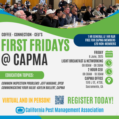 This month, we’re excited to welcome Jeff Marang from the Structural Pest Control Board, who will be discussing common B3 violations, and Kaylin from CAPMA, presenting on Communicating Your Value.