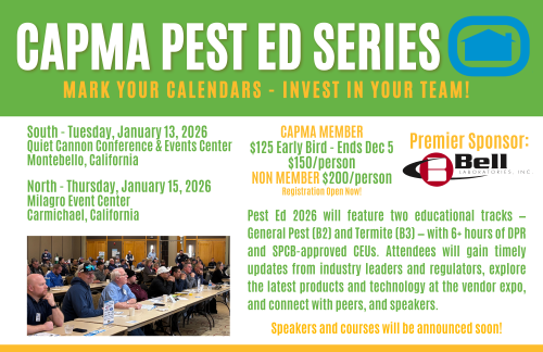 The CAPMA Pest Ed Series is a one-day training event held annually in Northern and Southern California. Designed for pest management professionals, it offers 6+ DPR and SPCB-approved CEUs, expert-led sessions, and timely industry updates.