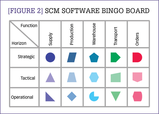 The net result of 40 years of SCM software development, including 20-plus years of commercial off-the-shelf software, is that the SCM software landscape in place in most companies is a hodgepodge of solutions that looks like a bingo game board. This is illustrated in Figure 2, where each shape in the grid represents a different solution with a different architecture. The consequences of this situation seep into all aspects of SCM software. The systems are difficult to change, do not easily adapt to changing business processes, learn only through manual intervention, and are difficult to synchronize cross-functionally back to enterprise business goals.