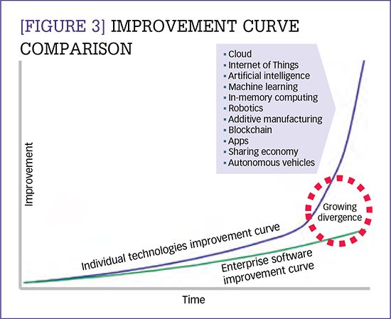 As shown in Figure 3, a significant divergence has emerged between the pace of improvement in enterprise software and improvement in individual technologies; this is particularly true for technologies made available to consumers, whether in smartphones, "smart" homes, or in consumer products such as automobiles. By contrast, for various structural reasons, enterprise software, such as that used for production planning, warehouse management, and transportation management, has followed a much more linear improvement curve and has yet to experience the type of rapid improvement seen in individual technologies. "Bending the improvement curve upward" will require the adoption of a new architecture with new elements.