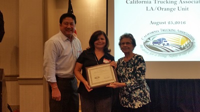 CTA President Mike Yadon presented Alvarez Trucking a 50-year membership plaque. Anita Ortega and Micaela Alvarez accepted the award.