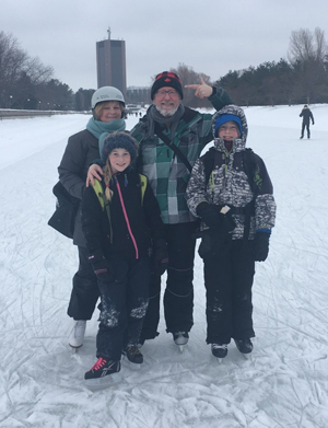 J’arbore ici la tuque de 2016 pour patiner avec ma famille sur le canal Rideau lors du festival Bal de Neige à Ottawa. En arrière-plan, le meilleur établissement d’enseignement au Canada (l’Université Carleton). Note : j’ai enlevé mon casque pour la prise de photo et je l’ai remis tout de suite après?! |