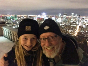 Me voici avec la tuque de 2015 et ma fille Maggie au sommet du Mont-Royal avec la ligne d’horizon montréalaise en arrière-plan. Une superbe journée de week-end en famille?! |