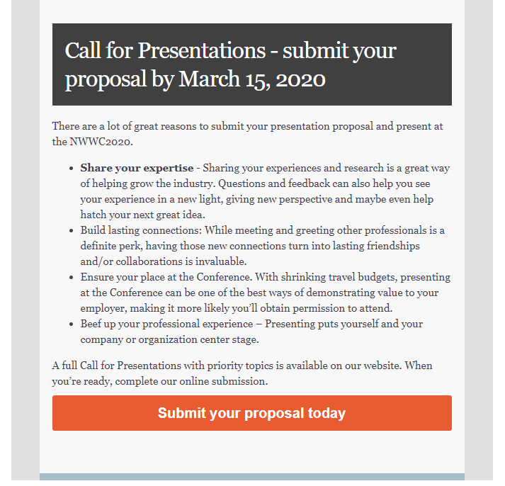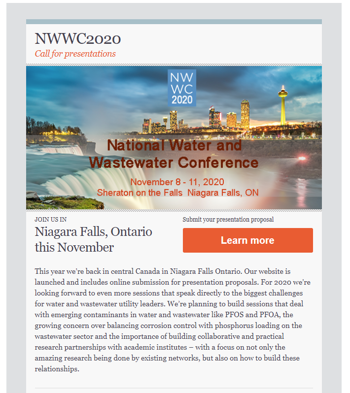 NWWC 2020 - Call for Presentations Now Online Print this Article | Send to Colleague Back to Canadian Water and Wastewater Association eBulletin