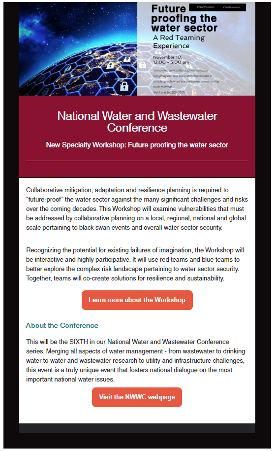 NWWC 2020: New Specialty Workshop: Future proofing the water sector Print this Article | Send to Colleague Back to Canadian Water and Wastewater Association eBulletin