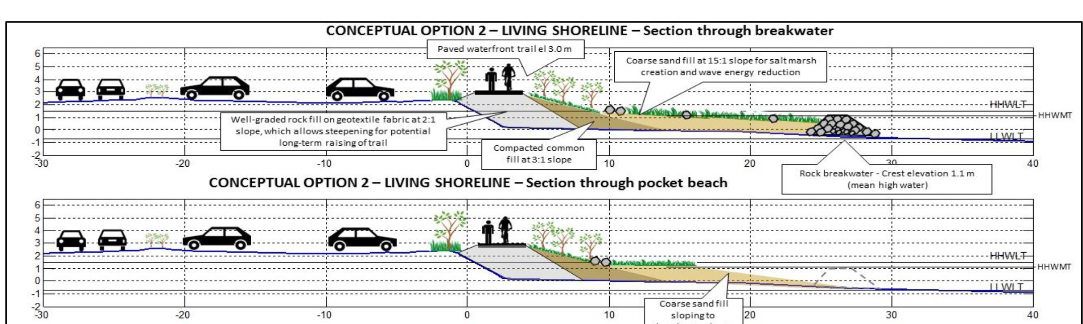In order to integrate engineering protection measures with the aesthetic enhancement of the shoreline and the development of a healthy ecosystem CBCL developed a detail design of living shorelines as coastal erosion mitigation options. This approach will provide an opportunity for re-establishing saltmarshes and coastal wetlands in the area.