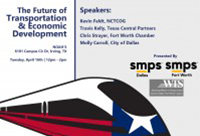 Please SMPS Dallas, SMPS Fort Worth and the DFW chapter of Women’s Transportation Seminar (WTS) for a panel discussion, lunch and networking with representatives from some of the most important voices in the future of regional transportation and economic development. The lunchtime panel discussion will center around the near-term and long-term visions for transportation infrastructure development in North Texas and the economic impacts those developments could have.