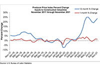 Construction input prices increased 1.4% in November compared to the previous month, according to an ABC analysis of the BLS’ Producer Price Index data released today. Nonresidential construction input prices also increased 1.4% for the month.