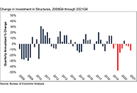 The U.S. economy grew at a 6.9% annualized rate in the fourth quarter of 2021, according to an Associated Builders and Contractors analysis of data released today by the Bureau of Economic Analysis. Investment in nonresidential structures decreased at an annual rate of 11.4% for the quarter and has now contracted in eight of the past nine quarters.